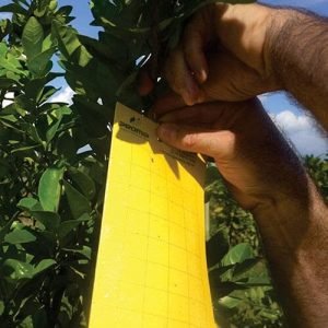 As armadilhas amarelas adesivas são as mais utilizadas para o monitoramento do psilídeo. Os insetos são atraídos pela cor da armadilha, e ficam grudados em uma cola especial que contém no cartão.